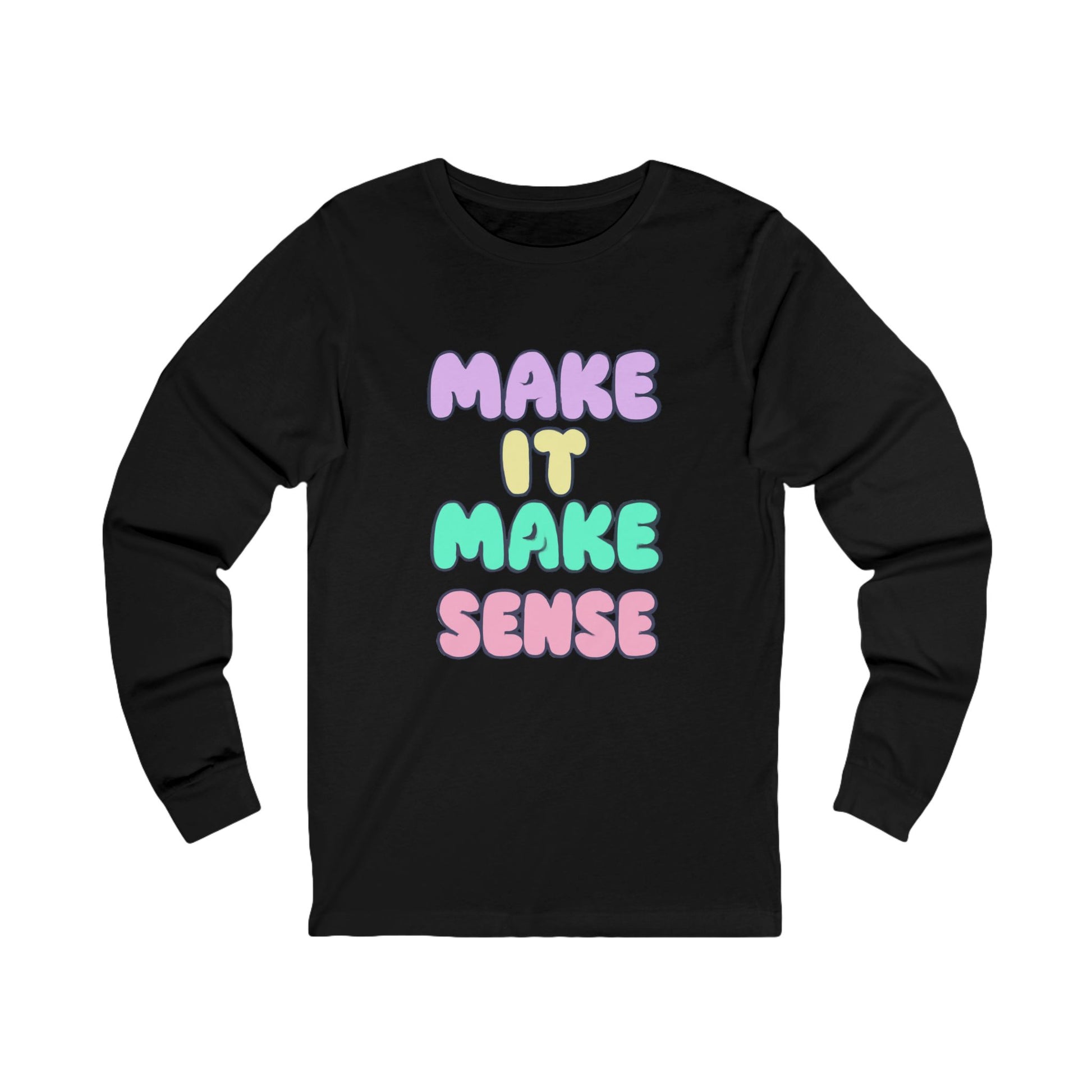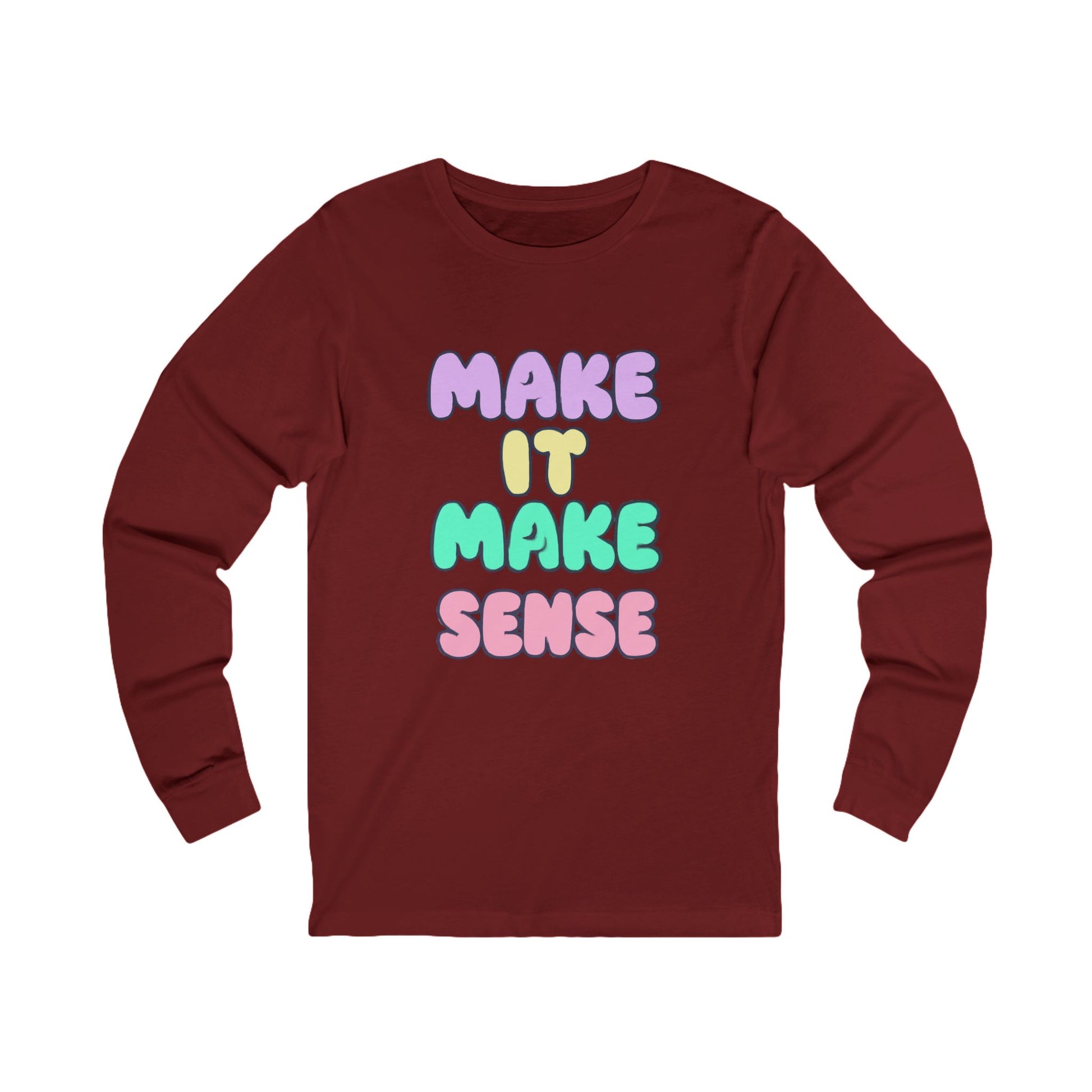 This Unisex Jersey Long Sleeve Tee combines comfort and style effortlessly. The playful design featuring the phrase "Make It Make Sense" brings a lighthearted vibe, making it an ideal choice for casual outings or cozy days at home. It's perfect for creatives, free spirits, and anyone who enjoys a bit of whimsy in their wardrobe. With its soft fabric, this tee is great for layering in transitional weather, making it a versatile addition to any wardrobe. Celebrate friendships, birthdays, or just the everyday moments with this unique piece. It also makes a thoughtful gift for holidays like Valentine's Day, or even as a cute surprise during a special gathering.